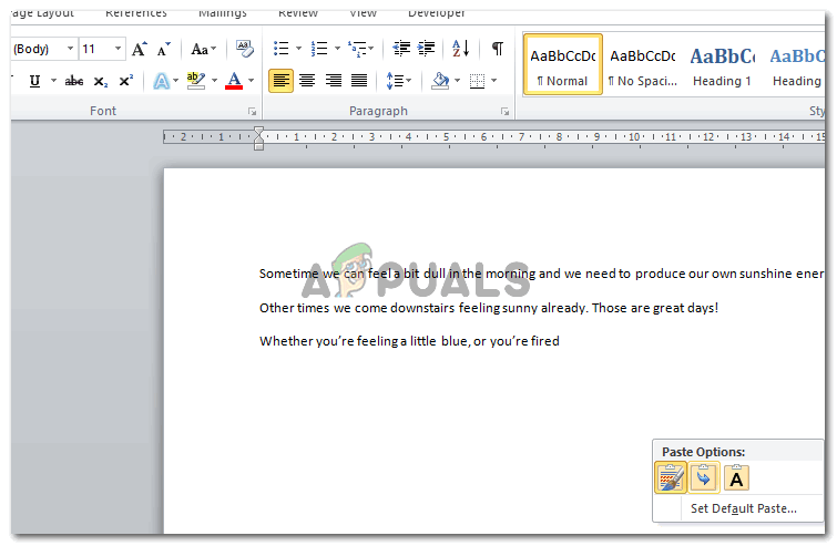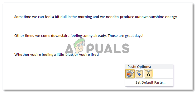 Merge Formatting, Notice that the paragraphing and spacing of the text is the same as the original text, while the font style is according to Microsoft Words default setting. - The third tab is for ‘Keep Text Only’. This is the tab which must be used to remove all sorts of formatting from a copied text. This will remove the text style, spacing and everything related to formatting on the copied text, and paste it just as text which will look something like this.