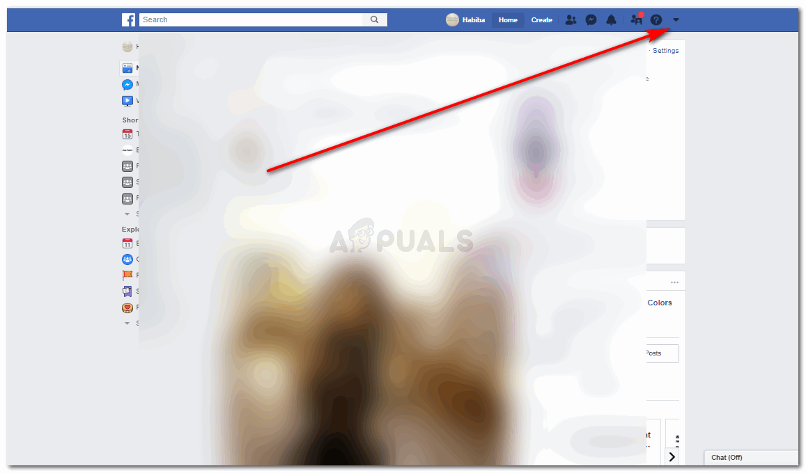 - Sign in to your Facebook account. Your newsfeed window will be your default screen for now. Click on the downward facing arrow that is in the right top corner of the page as shown by the arrow in the picture below.
