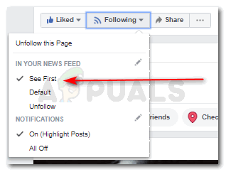 If you will have not followed that page, it is possible that instead of following, the word would be ‘follow’. And in this case, you will have to follow the page first, and then go the next step. - The next step is to check the option for ‘See First’, as shown in the image below.