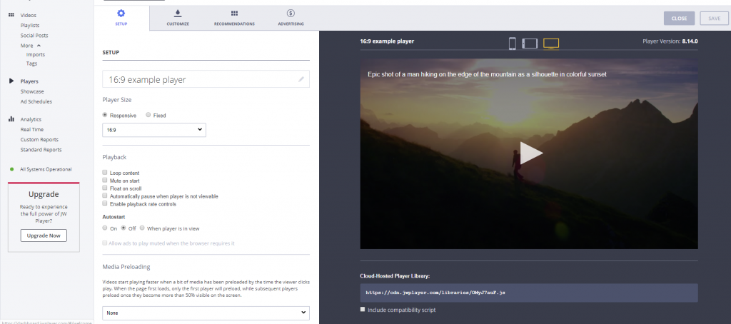 You can either call use a self-hosted player and customize and tailor it according to how you see fit, or use JWPlayer’s player and make one for yourself. If you choose the latter, you will simply need to add the Cloud Hosted Player Library block of code in the <head> tag of your webpage.