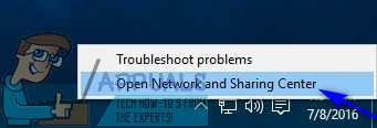 - Click on Open Network and Sharing Center in the resulting context menu.
