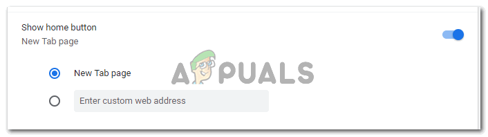 The slider switch will turn blue the instant you click on it. - Once the tab has been enabled, it will show on the top toolbar of Google Chrome. But before that, you need to select either of the two options that appear right under the Show Home Tab option. These options basically represent what function is expected out of the home tab. The home tab can either open up a new tab for you once you click on it or, it can open the webpage of your choice, which is a link you will enter in the space for the second option that says ‘Enter custom web address. Both the options cannot be selected at one time, so you will have to choose between the two.