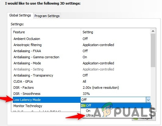 Manage 3D Settings - Locate “Low Latency Mode” in the list of settings on the right side of the NVIDIA Control Panel. Click the dropdown box and following three options will show