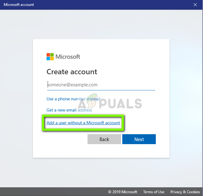 Creating a local account on Windows 10 - At the next screen, click on the Add a user without a Microsoft account hyperlink.