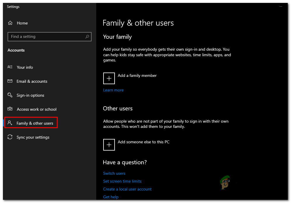 Opening the Email & app accounts of the Settings page - Once you make your way to the Email & accounts menu, click on Family & other users from the left-hand menu on the right.