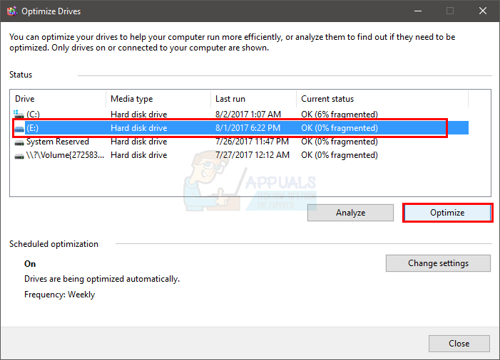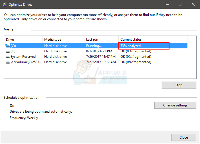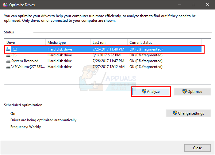- Once the Analyzing period is finished, you should be able to see the fragmentation status of your drives. If the drive you selected is heavily fragmented then select your drive and click on Optimize. This will start the defragmentation process