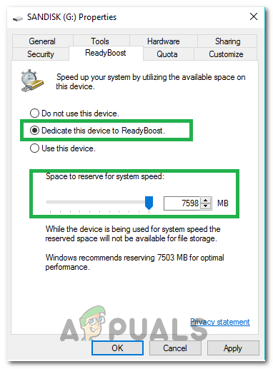 Selecting the “Dedicate this device to ReadyBoost” option - Click on “Apply” to save your changes and click on “OK” to exit out of the window.