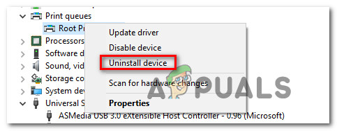 Uninstalling every printer driver - Once every printer driver has been uninstalled, expand the drop-down menu associated with Universal Serial Bus controllers. Next, scroll through the list of installed items and uninstall every Printer port by right-clicking on each one and choosing Uninstall from the context menu.