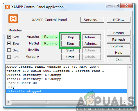 - Open XAMPP control panel and click on the “Stop” button for both “Apache” and “MySQL“.