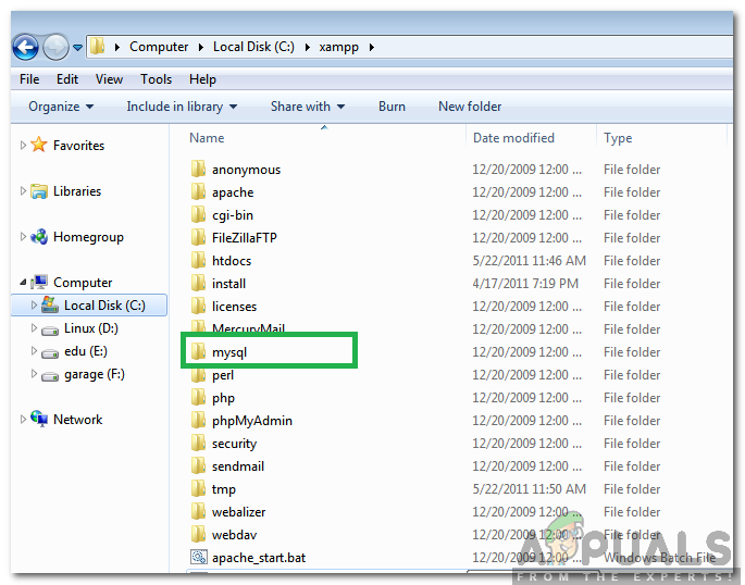 Pressing the stop buttons for both MySQL and Apache - Navigate to the installation directory for “XAMPP” and double click on the “MySQL” folder.