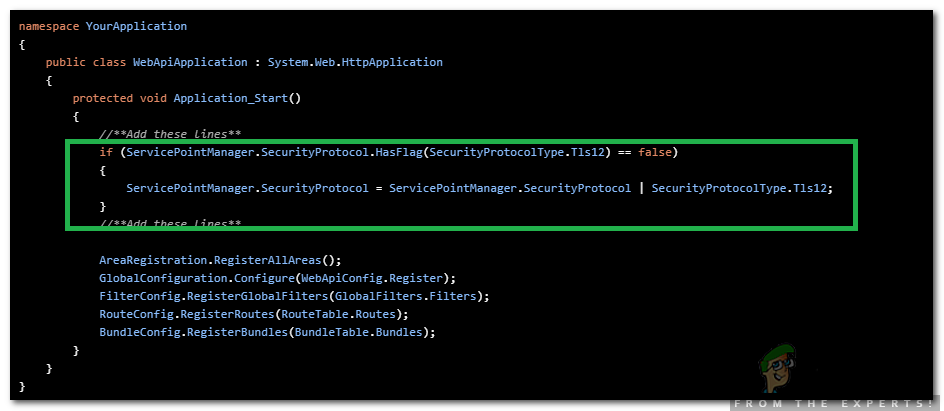 if (ServicePointManager.SecurityProtocol.HasFlag(SecurityProtocolType.Tls12) == false) { ServicePointManager.SecurityProtocol = ServicePointManager.SecurityProtocol | SecurityProtocolType.Tls12; }