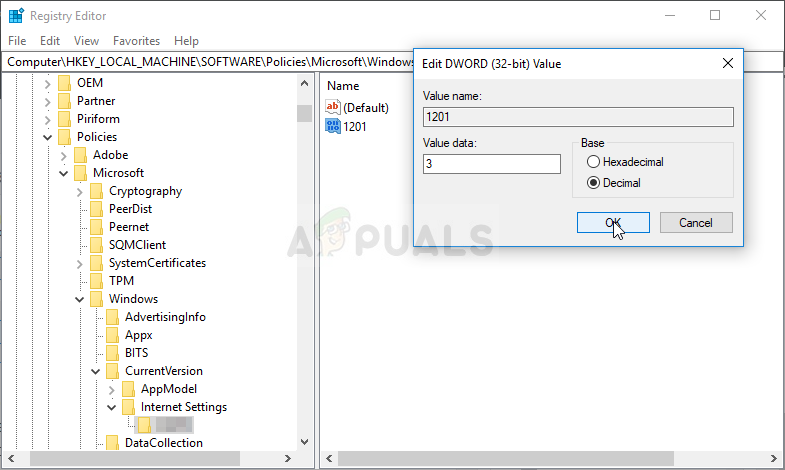 - Click on this key and try to locate an entry named 1201. If it’s not there, create a new DWORD Value entry called 1201 by right-clicking at the right side of the window and choosing New >> DWORD (32-bit) Value. Right-click on it, and choose the Modify option from the context menu.