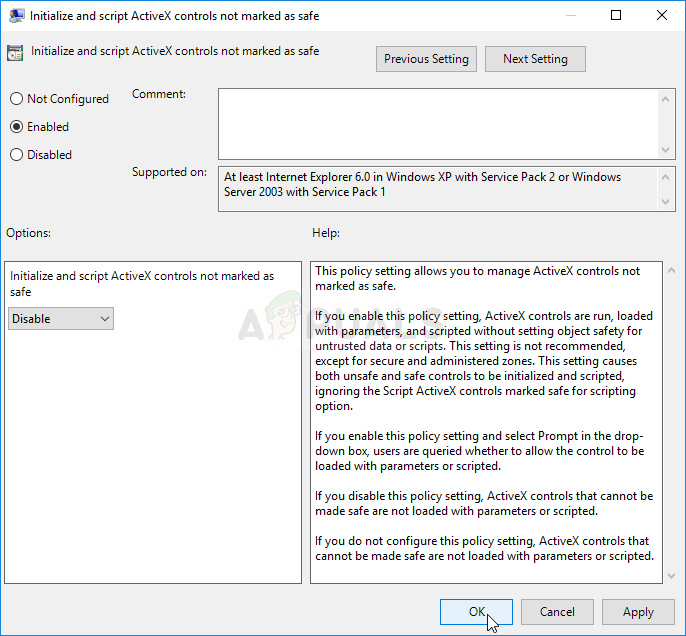 - Double click on the “Initialize and script ActiveX controls not marked as safe for scripting” policy and check the radio button next to the “Enabled” option.