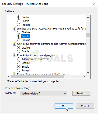 - Make sure the checkbox next to the Initialize and script ActiveX controls not marked as safe for scripting is set to Enable. Click the OK button at the bottom of both windows.