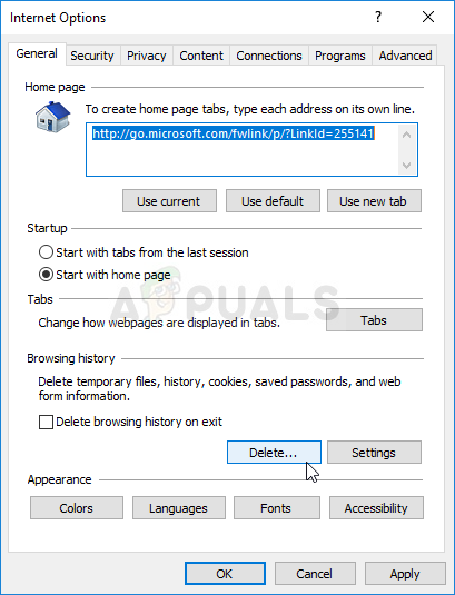 - Head back to the Internet Options screen but this time, navigate to the General tab. Under the Browsing history section, click the Delete… button.