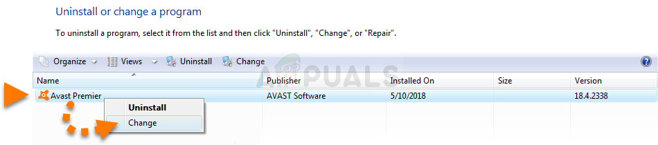 - Locate Avast in Control Panel or Settings and click on Change. Follow any instructions which may appear afterward in order to repair it completely.