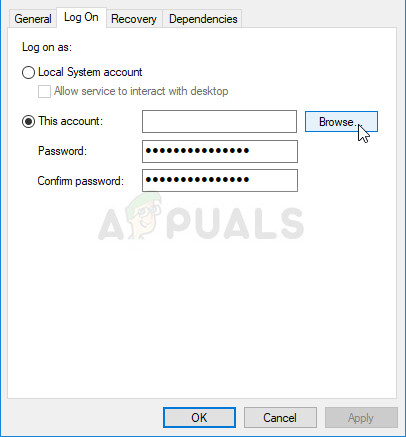 - Follow steps 1-3 from the instructions above in order to open aswbIDSAgent Service’s properties. Navigate to the Log On tab and click on the Browse… button.