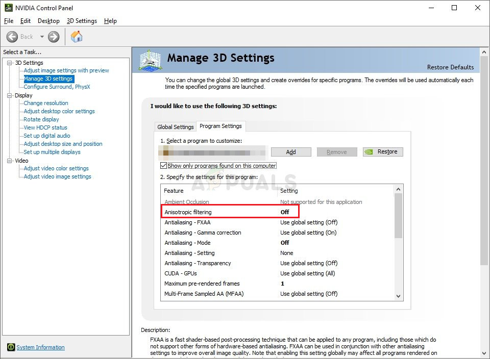 - Under the Specify the settings for this program section, scroll down until you see the Anisotropic filtering Click under the Settings column and switch it to Off.