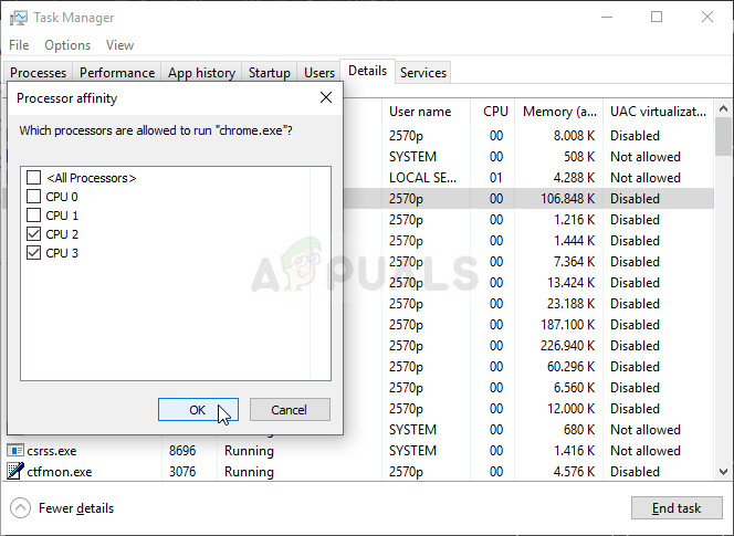 - In the Processor affinity window, make sure you only uncheck one or two cores of your processor (one of the entries named CPU 0, CPU 1, etc.) and click the OK
