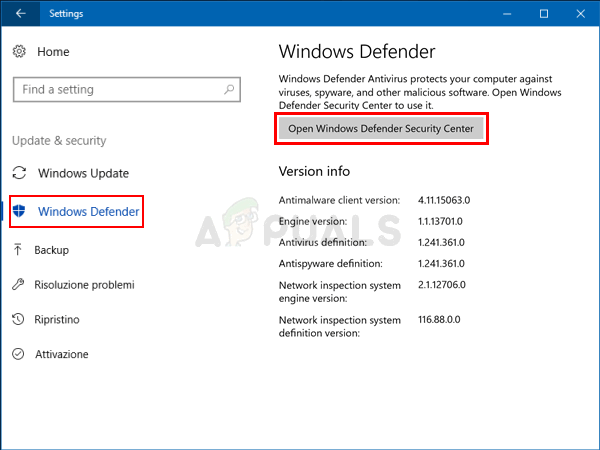 Opening Settings from Start menu - Click to select the Update & Security section and navigate to the Windows Security tab. From the top of the window, click the Open Windows Defender Security Center option.