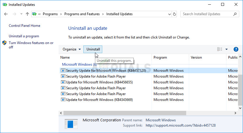 - Click on the update once and choose the Uninstall option at the top and follow the instructions which will appear on screen in order to get rid of the update.