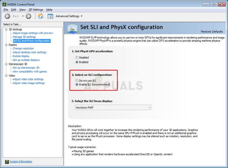 - At the end, select the Do not use SLI technology option and click on Apply to confirm the changes. Launch BioShock 2 again and check to see if the same error still appears.