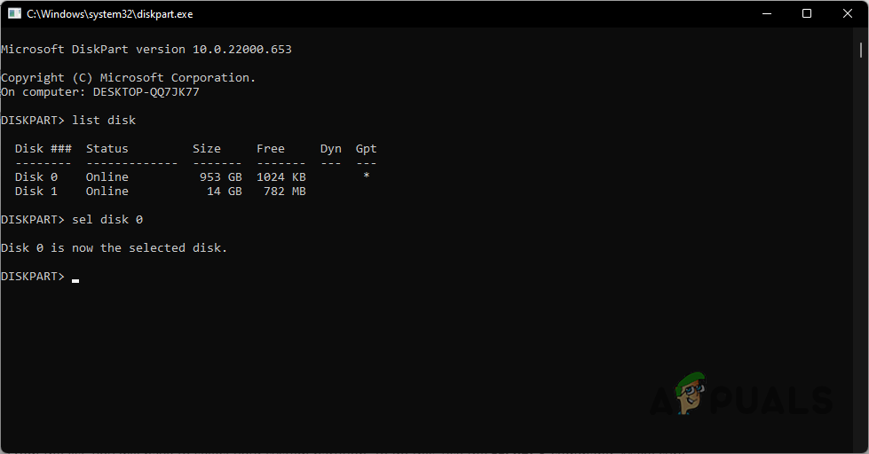 - From the list of drives available, select your boot drive by using the sel disk X command where you have to replace X with the number of your boot drive. For example, sel disk 0.
