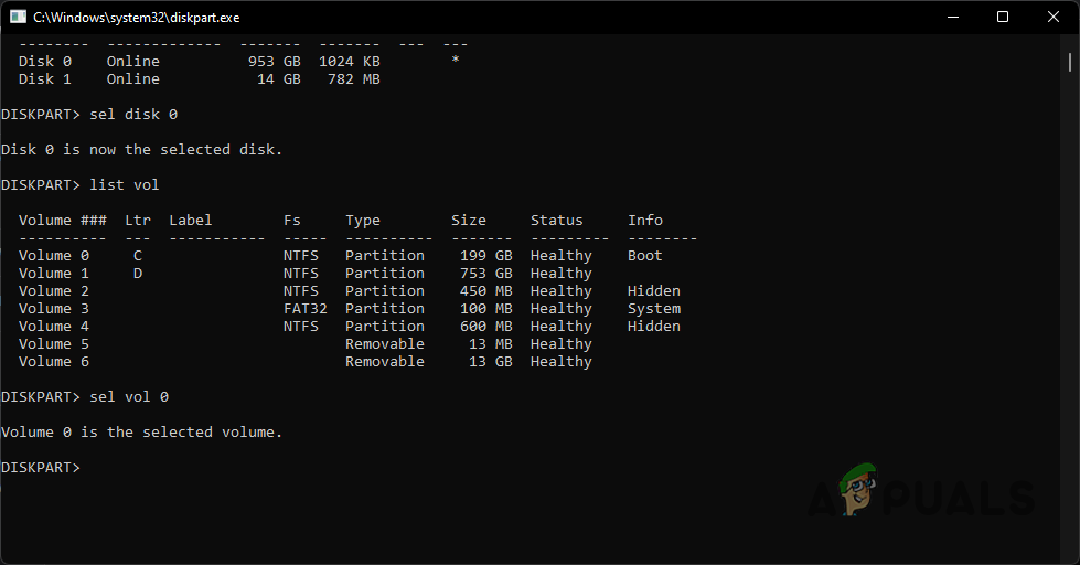 - From the list, you will have to select your system partition. To do this, use the sel vol X command. Make sure to replace X with the number of your system partition again.