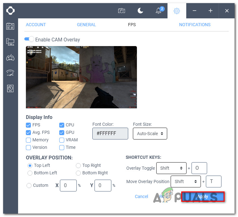 After you are signed in successfully, you will be able to go to the Settings menu (gear icon at the top), go to the FPS tab and modify the toggle associated with Enable CAM Overlay so that it’s enabled. Then, click on Apply to save the changes.