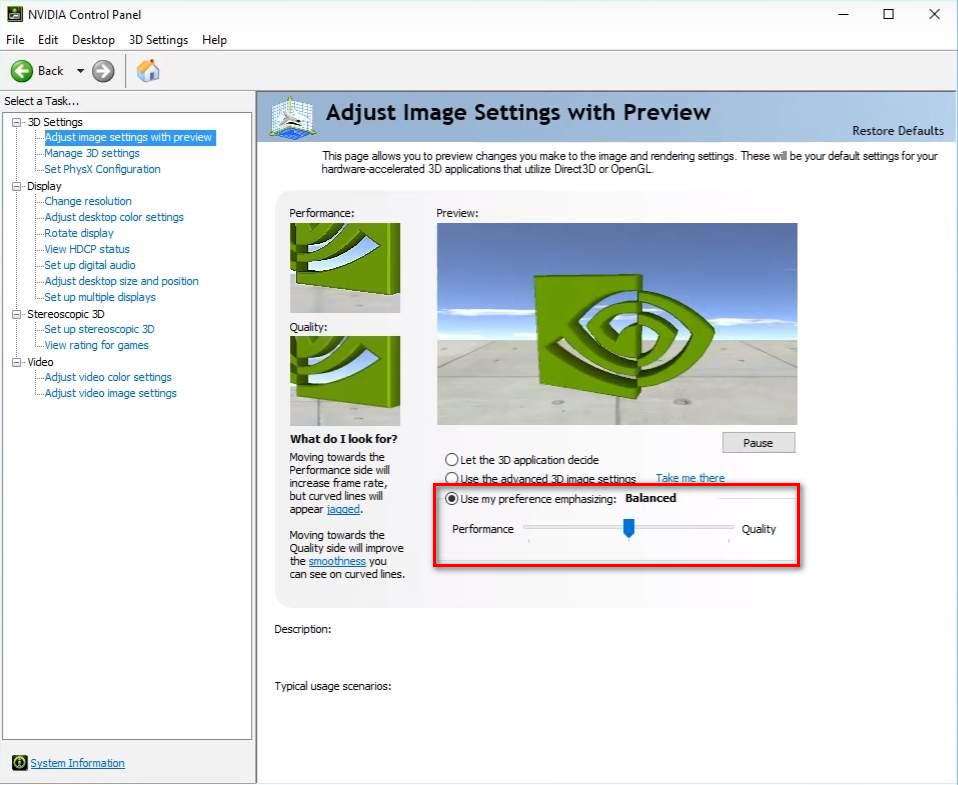 Access Nvidia Control Panel. - From the main-screen, try adjusting the slider and select “Use my preference emphasizing:” And see if it makes any difference when launching the game.