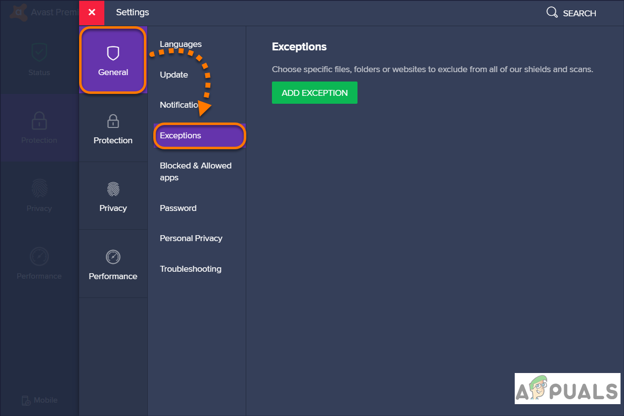 Using Avast as an example. - Navigate to Exceptions.