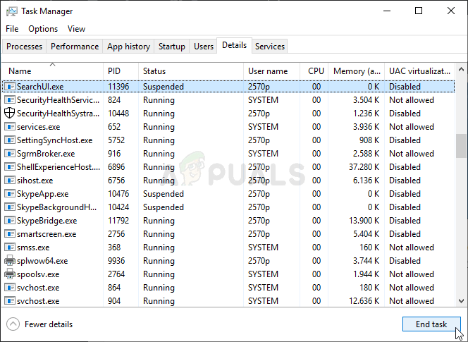 Opening Task Manager - Click on More details at the bottom left part of the window to expand Task Manager. Navigate to the Details tab and search for the SearchUI.exe entry. Select it and choose the End task option from the lower right part of the window.
