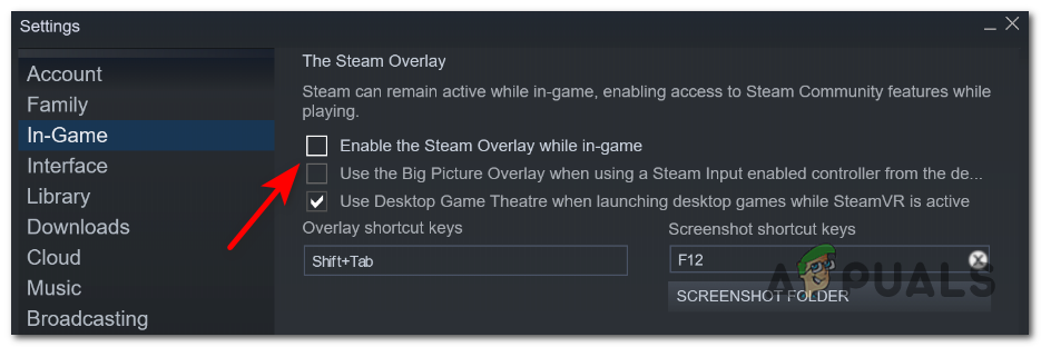 - After that, uncheck the first box where it says Enable the Steam Overlays while in-game.