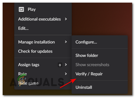 - After that, move the cursor right where it says Manage Installation and click on Verify/Repair to start the verification.