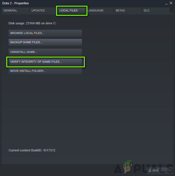 Verifying the integrity of game files should be our first step in the troubleshooting process. Checking the integrity of the game files is an in-built function of Steam which is available on all of the games installed on your computer on Steam. The engine compares each local file with a manifest which it downloads from the servers.