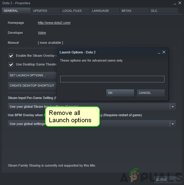 - Command-line parameters: If you are running the game through Steam, there are chances that you have specific command line parameters set in the application. Here, disabling all the parameters might help if any of them was the cause.