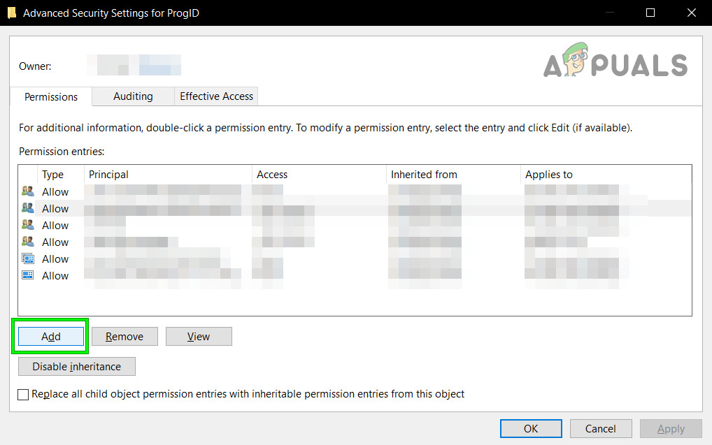 Open AppID in Registry Editor - Go to the folder which has the same APPID you received in your error message. Right-click and choose permissions and select “Advanced“.