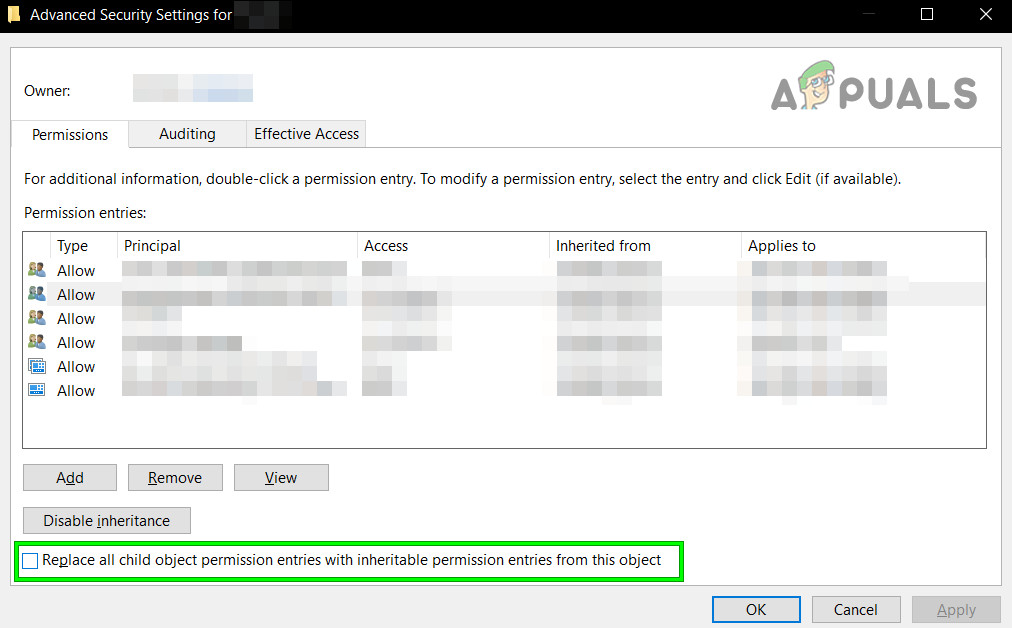 - At the bottom of the owner window, also select Replace all child object permission entries. Click OK, and then select Yes to the Windows Security warning.