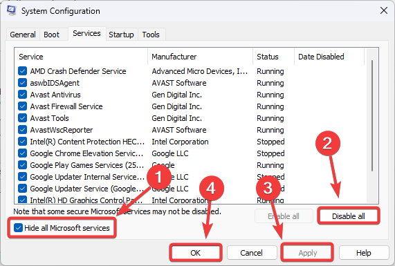 - Open the Services tab and check Hide all Microsoft services.