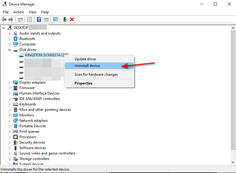 - Right-click the problematic drive and select Uninstall device.