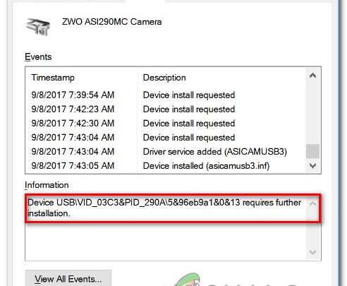 Note: If you’re prompted to restart before every Windows update is installed, do so, but make sure to return to this screen at the next startup sequence and complete the rest of the update installations. - Once your Windows build is up to date, return to the Events tab of the device that was showing the ‘Device requires further installation’ error to see if the issue is resolved.