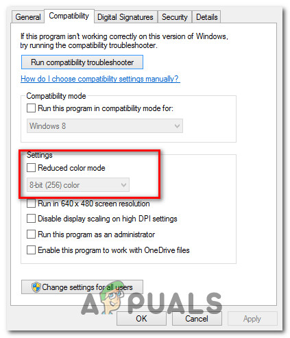 - The application doesn’t support the system’s color mode – If you’re encountering this issue with a game that was not originally designed to support a 32-bit color depth, you might be able to avoid the error altogether by forcing the game executable to run in Reduced Color Mode (16 Bit).