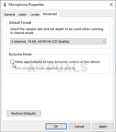 - Uncheck the boxes next to the “Allow applications to take exclusive control of this device” and “Give exclusive mode applications priority”. Apply these changes as well and repeat the same process for your Speaker device in the Playback tab before you close these windows. Reopen Discord and check to see if the error persists.
