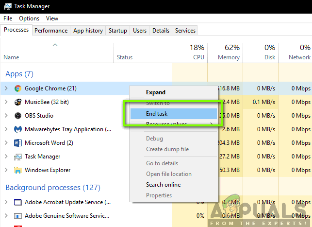 This solution is common sense but many users fail to notice this scenario. Whenever you are streaming using OBS Studio and playing a game side by side, it is important that all the extra applications running the background are closed so your CPU can solely focus on the two processes. You should also take into account the background processes running which might not be noticeable in the foreground.