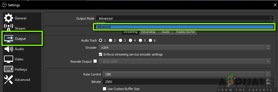 - Now click on the Output tab using the left navigation pane, select Advanced output mode and check the option of Encoder.