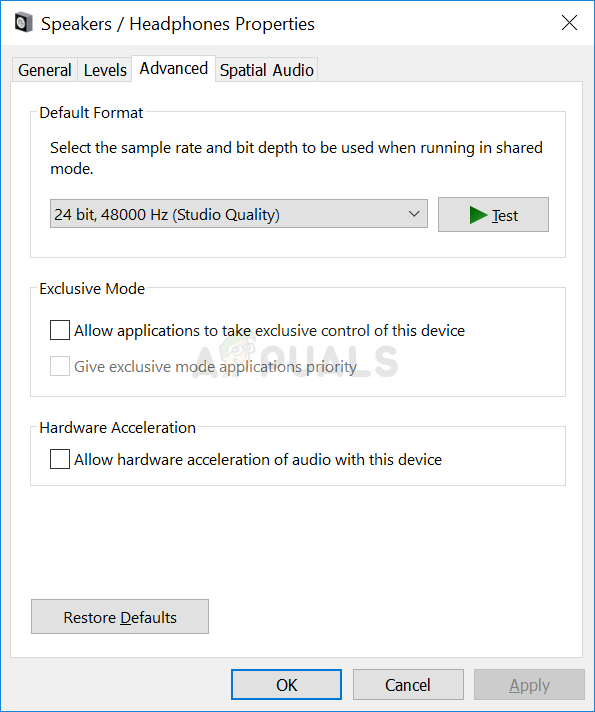 Disabling audio hardware acceleration - Uncheck Allow hardware acceleration of audio with this device. Check if Equalizer APO now works properly.