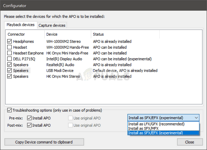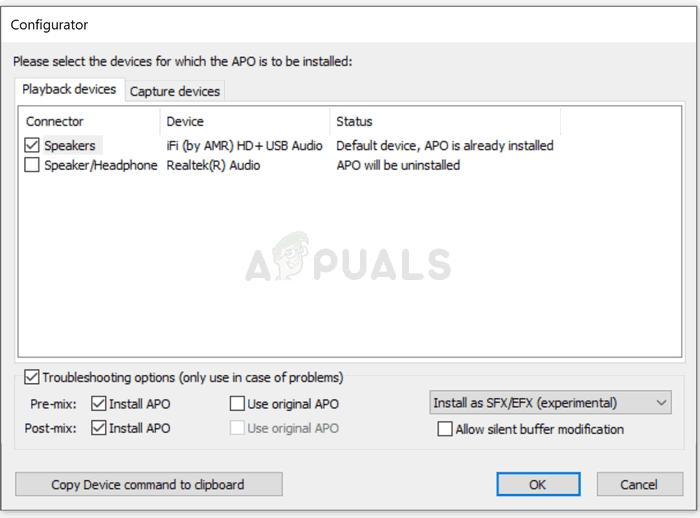 - Open Configurator from the Start menu and go to the Playback devices tab. Select the device and click Copy Device command to clipboard to copy the device’s info.