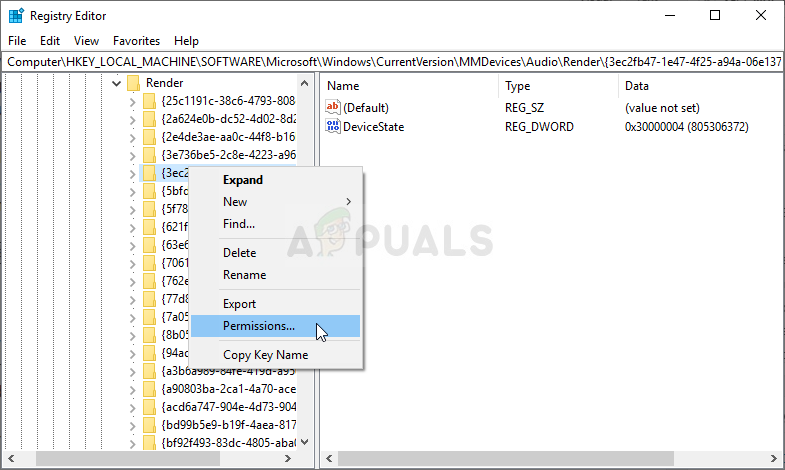 - Find the key matching the bolded part, right-click it, and select Permissions.