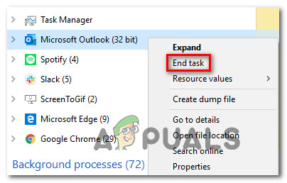 - Outlook data is being used by another program – Certain add-ins or spam filters have the potential of keeping Outlook away even when the program is close conventionally. Whenever this occurs, a leftover process will end up triggering the error code once the Outlook data file is being modified. In this case, you can resolve the issue by closing the Outlook process.