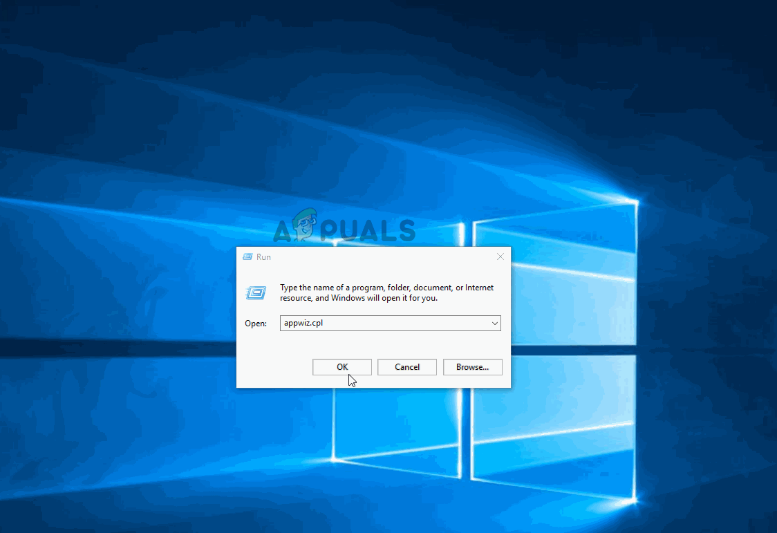 - Press Windows key + R to open up a Run dialog box. Then, type “appwiz.cpl” and press Enter to open up the Programs & Features.